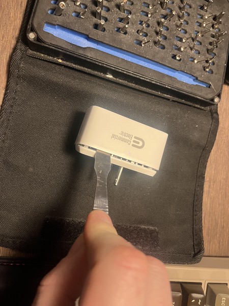 The CE SP1 was luckily quite easy to pry open using a metal spudger. The case is held together with 4 plastic clips built in to the housing. By carefully prying between the upper and lower part of the case, I was able to separate the two parts without breaking the clips (essential for re-assembly).